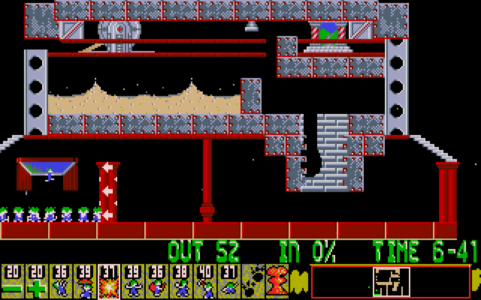 • Levels will be updated to take advantage of pixel-precise triggers and steel placement, etc. (For example, things like exits that were half-buried in terrain to make them work will be repositioned.) A few symmetrical (or semi-symmetrical) levels will also make use of left-facing exits (for example, Mild 6, Medi 28, Danger 17, etc).