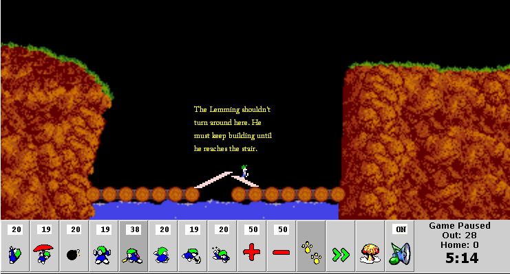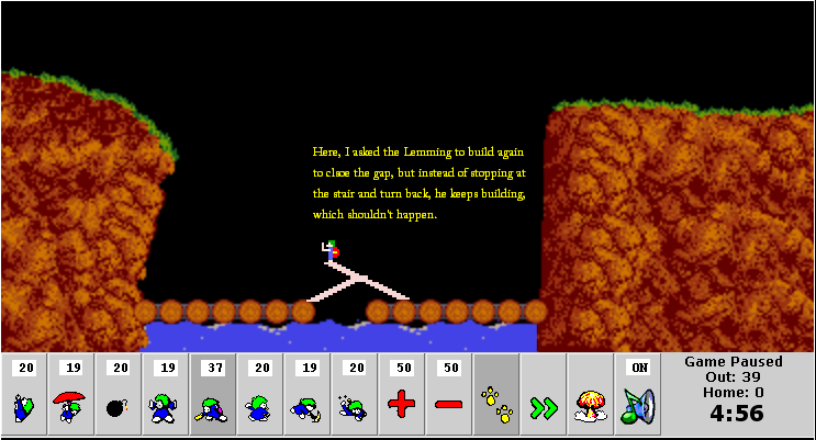 Ah, by the way, another bug I discover: if you force a lemming to build a bridge once he has turned back from a blocker, well, he builts it, but when he returns to the blocker & turns back again, there seems to be an invisible "fence" or wall on his way, which the lemming jumps without problems. It's another bug, but it's funny  http://www.lemmingsforums.com/Smileys/lemmings/thumbsup.gif" alt=":thumbsup:" title="Thumbs Up" class="smiley" />