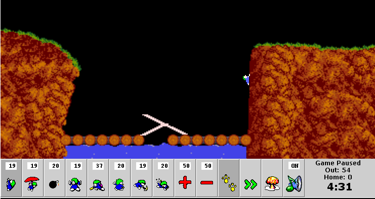 - Calling nuke when a Lemming is about to drown causes the game to freeze entirely.