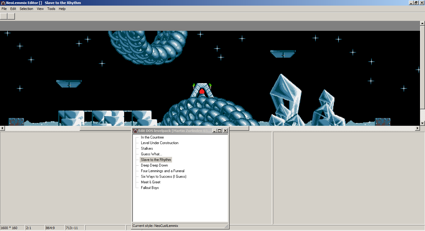 Alright! Here's NeoLemmix Editor V1.06n-B. http://www.lemmingsforums.com/Smileys/lemmings/smiley.gif" alt=":)" title="Smiley" class="smiley" />