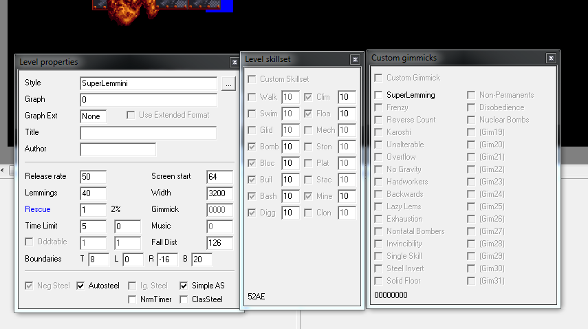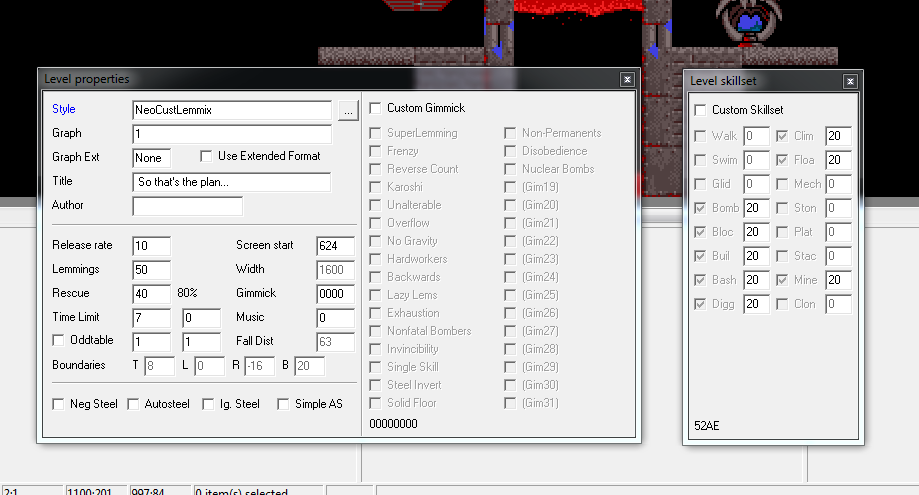 So, working on the editor. Not ready for the release yet - it can't do anything it couldn't do before yet - but I have, as mentioned, split the Properties and Skillset into two seperate windows. Further improvements to the skillset window will be on their way later (tidier layout, checkbox for infinite skills setting, etc). http://www.lemmingsforums.com/Smileys/lemmings/smiley.gif" alt=":)" title="Smiley" class="smiley" />