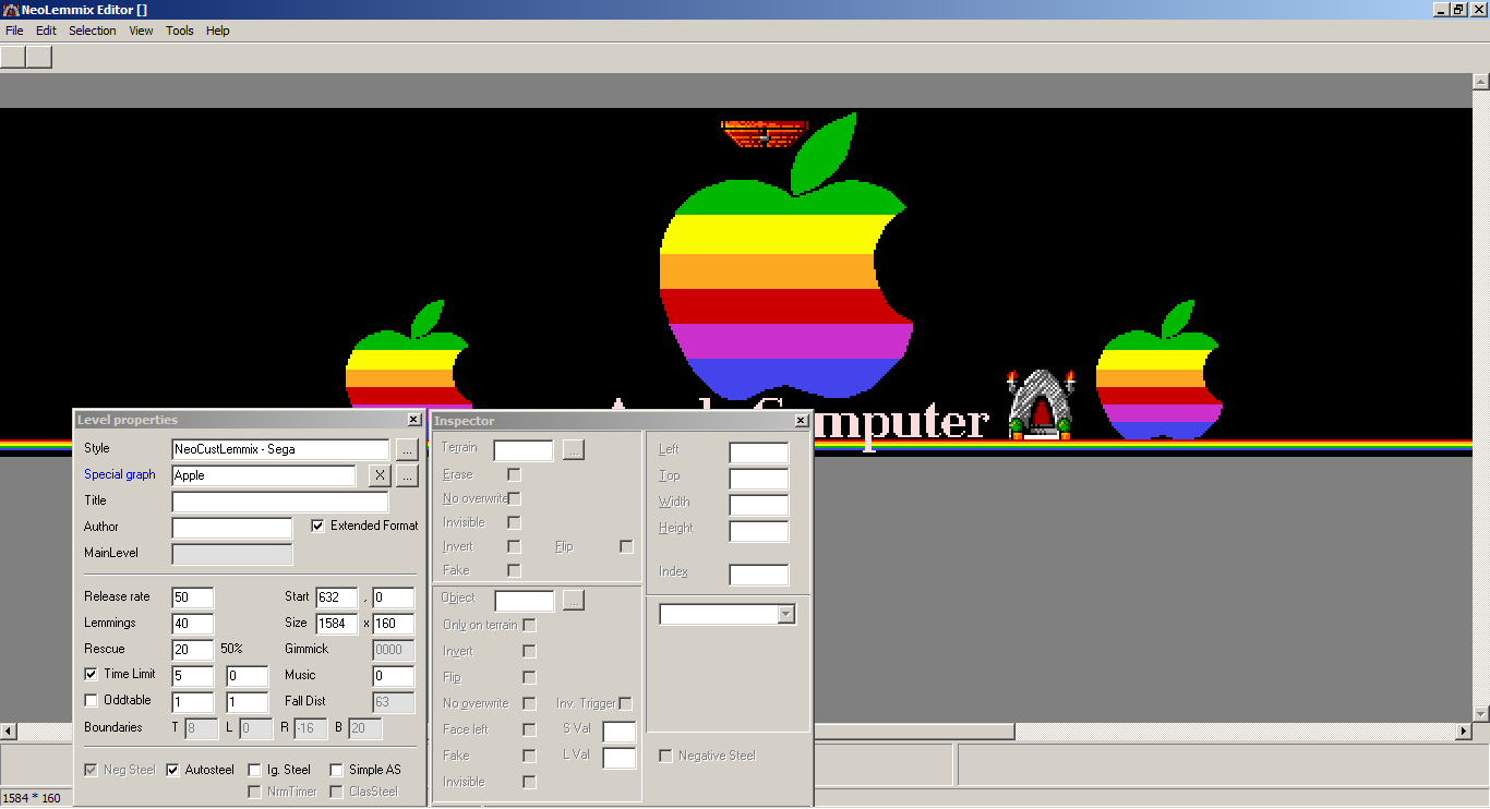 As for that glitch - it would seem that the editor (not the player) has the glitch; it's displaying the VGASPEC image further to the right than it should be. EDIT: I checked, and it's off by 8 pixels - exactly half of the difference between 1584 and 1600. Because of how the editor tries to auto-center VGASPEC images in (Neo)Lemmix formats (but not SuperLemmini format, where it instead uses the positioning data specified in the special graphics INI file), it's almost certian that this issue was introduced when the default width was corrected to 1584 - in fact, if you use a level with width of 1600, it should line up correctly.