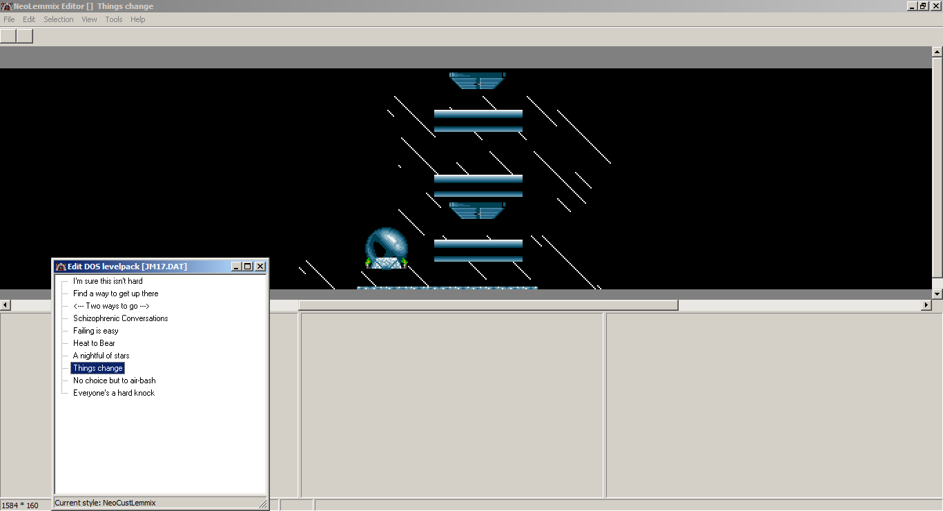 Also something worth pointing out, and this has also happened in EricLang's version: some levels that were previously made in DOS LemEdit end up with white lines. Attached is an example. Clicking on a white line gives me the error "List index out of bounds (61)"