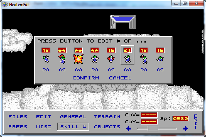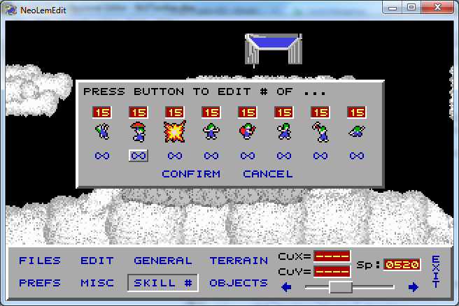 Well, NeoLemEdit can finally actually edit something! At this stage, it can only edit the skills, though. Besides the traditional setting the amount of skills, it also has a button to set a skill's uses to infinite, as supported in NeoLemmix V1.05n and onwards (if you try to load such a level in older versions or other engines, depending on the engine in question it'll either give you 200, 99 or none - older Lemmixes do 200, I believe).