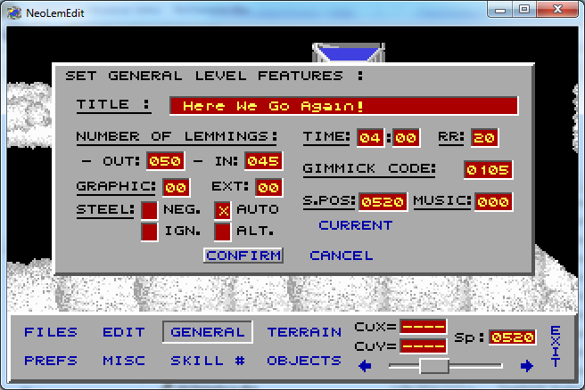 EDIT AGAIN: And it's functional now. Including that if you change the graphic set number, once you exit that menu (it doesn't do it in the background while you're still in there), it correctly loads up the new graphic set. (VGASPEC support still isn't implemented; the Ext field just allows you to view/change the extended set number stored in the level file.) You probably also notice that I expanded the time limit minutes, graphic set number and VGASPEC number fields to 2 digits, and the lemmings and requirement to 3. =)