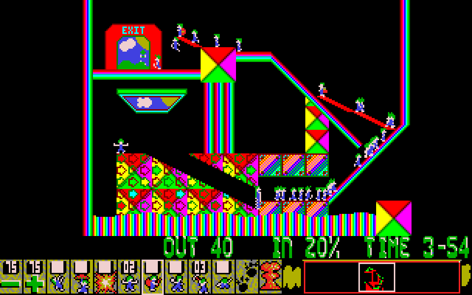 Let me know if you discover any glitches that are listed as fixed but can still occur under certain circumstances (and what those circumstances are), or any new glitches that have come up. (Already had one - there was a glitch where if you use a bomber on a one-way wall, then bash or mine in the wrong direction and part of what the bomber removed falls under the mask, the mask-covered parts of the one way would spontaneously regenerate; I've fixed this though.) Also, if there's anything that just feels too weird. (Note: Miners look like they're incorrectly positioned on certain frames, though this is purely graphical. Easiest way to address this would be simply editing the sprites to move them one pixel down, but for now, it's a purely-graphical glitch anyway.)