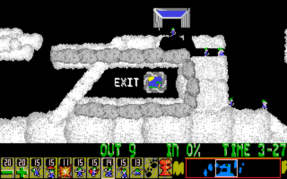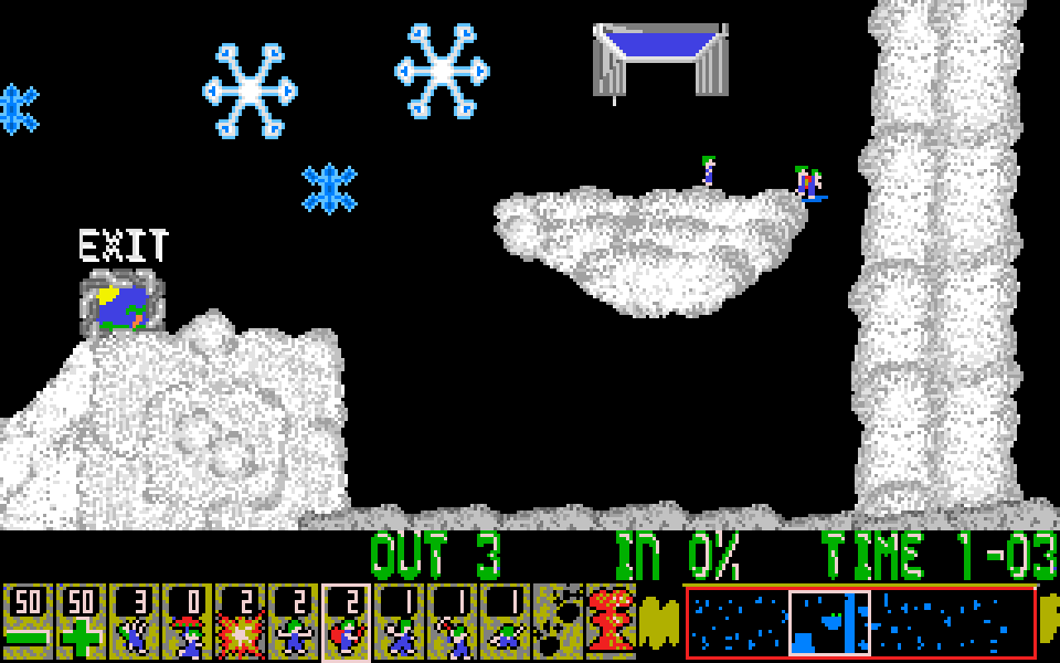 In case anyone forgot, the level has 50 lemmings, requires 90% (45 lemmings), has a release rate of 20 and a time limit of 4 minutes, and gives 15 of each skill.